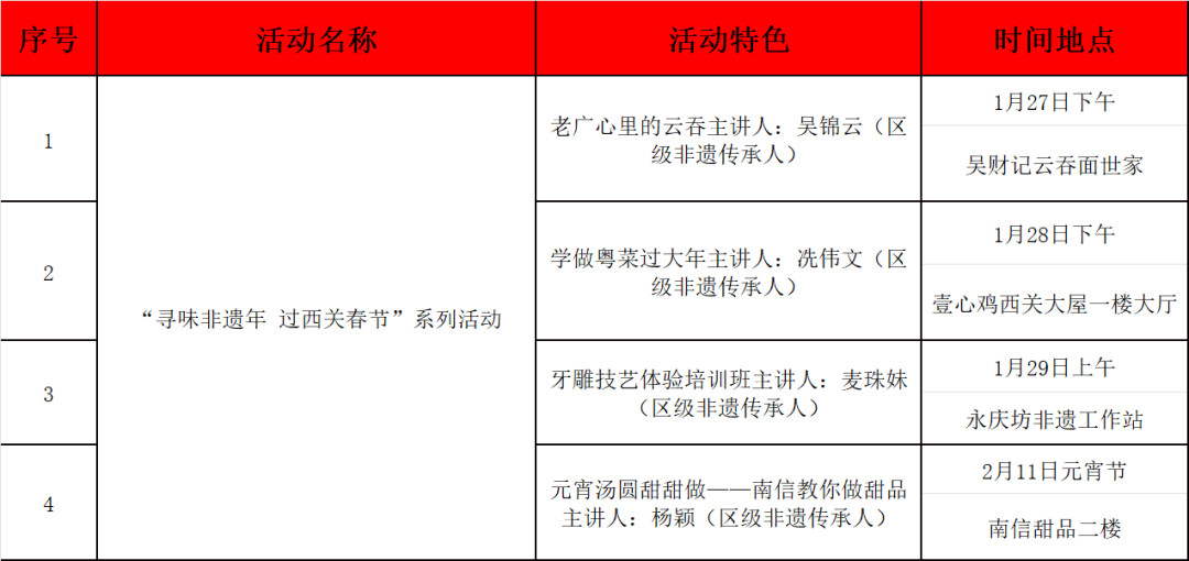 活动将邀请主播达人以直播方式助力“做粤菜过大年”“西关肠粉里的年味”“老广心里的云吞”“元宵汤圆甜甜做”等非遗美食体验活动,在新春佳节散发浓浓西关美食味。
