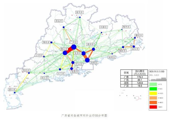 2021年,广州市规划和自然资源局发布《2020年广州市交通发展年报》给出了参考答案,以下是珠三角各城市之间的对外出行OD分布图