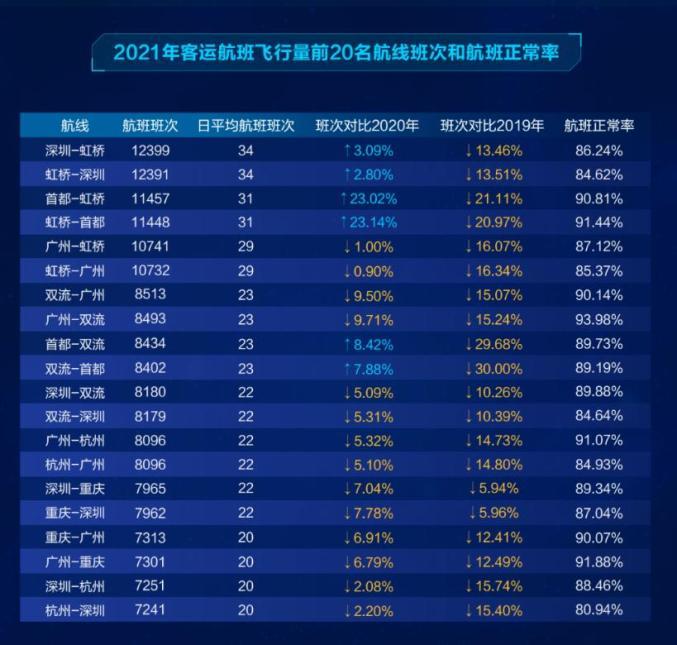 2021年全年,深圳机场飞往上海虹桥有12399个班次,日均34个班次,堪称中国内地最繁忙线路。