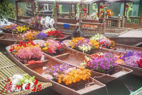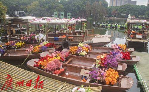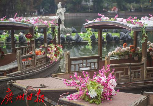 荔湾湖畔停泊着各式装饰靓丽的花船,重现历史悠久的水上花市场景。