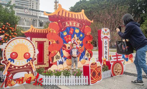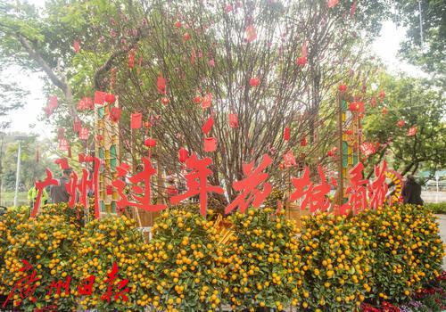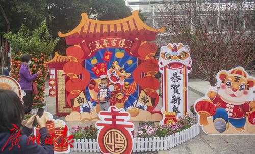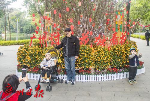 不少市民游客在“广州过年,花城看花”花坛前拍照留影。
