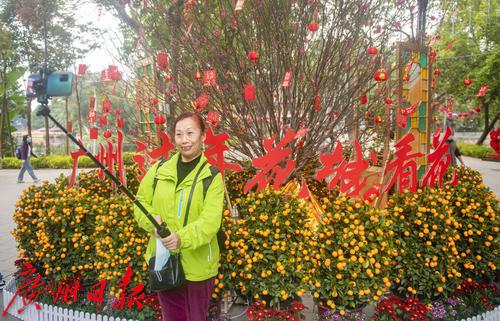 一位老街坊在“广州过年,花城看花”花坛前自拍。