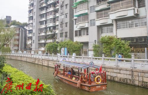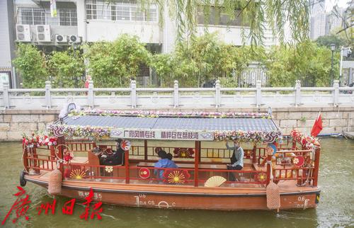 游人搭乘荔枝湾涌上的花船。观赏两岸景色。感受广府风情。