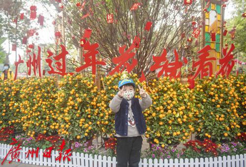 荔湾湖公园,一位小朋友在写有“广州过年,花城看花”标语的花坛前向家长比出V字手势拍照。
