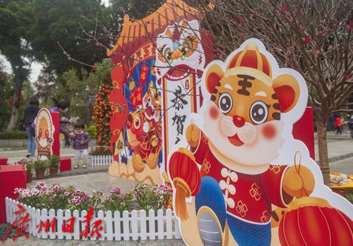 荔湾湖公园内一处绘有可爱的老虎形象喜庆布景,不少游人在此拍照。