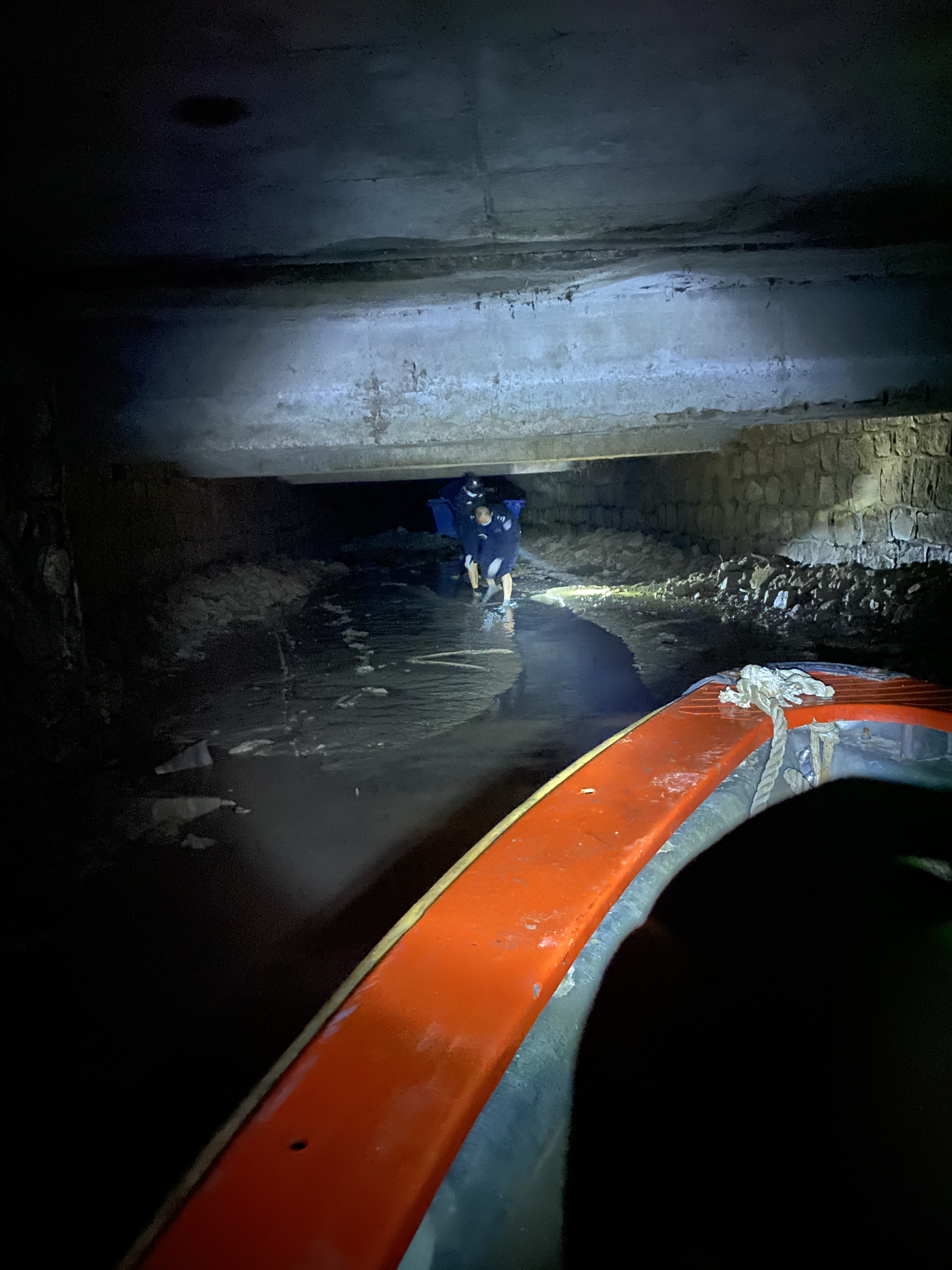 广州海关缉私警察驾船进入走私分子使用的下水道