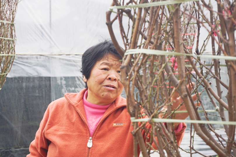 提到挑桃花的技巧,黎姨说:“全看‘眼缘’。”首先看树形,枝条排列要均匀;其次是花蕾分布不要太密,尽量挑选花蕾较多、较大,排列较为整齐的桃花;最后是花色,颜色鲜红则品质好。