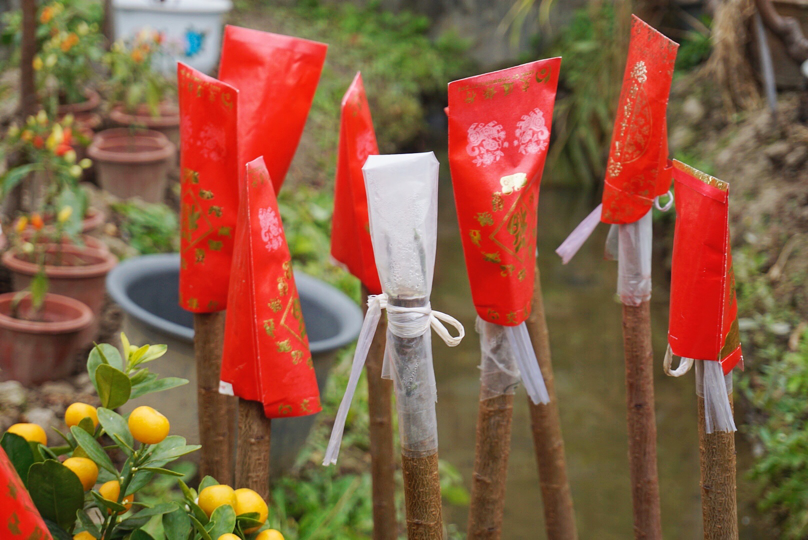 在黎姨经营的四分田里,种满了大大小小不同的桃花,树龄大多在一到三年。提到自家地里的桃花,黎姨非常骄傲。黎姨介绍,在海北村,农田的土壤都是天然的黑泥,含沙量少、水分多,加上直接引入花地河水进田里灌溉,整体环境非常适合桃花生长,海北桃花有三大特点:花期长、花形大和花色艳。环境固然重要,桃花开得好也与黎姨一年到头的辛苦分不开。由于桃花是一年一期生,每年春节过后,黎姨就要开始着手为下一年的“收成”做准备。黎姨的桃花园里,已经准备好了来年的花苗,“有些树砍掉后来年还能开花,有些树就全部砍掉换新。”