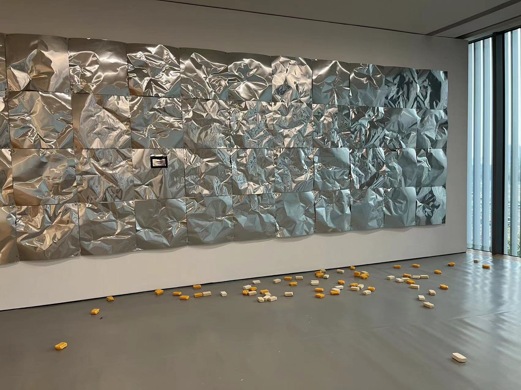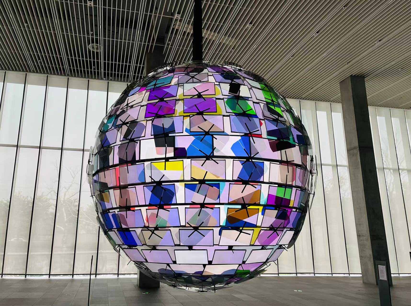 在“时间姿容”单元的参展作品中,艺术家王郁洋制造了一个“月亮”,营造极具未来感的现场。该作品名为《人造月2》,直径达4米,用了260多枚透明的偏光片,在纯色的日光灯源下,通过旋转呈现出了目眩神迷的色彩。每一个偏光片的运动是随机产生的,所以观众看到的球体是不断变化的。王郁洋正通过这个巨大的球体结构证明,我们身处的系统结构与信息中心,它们是许多可见与不可见的结合,它们展现出丰富变幻与无限可能,并希望通过这件作品传达他对当下各种人造自然环境的一种反思。