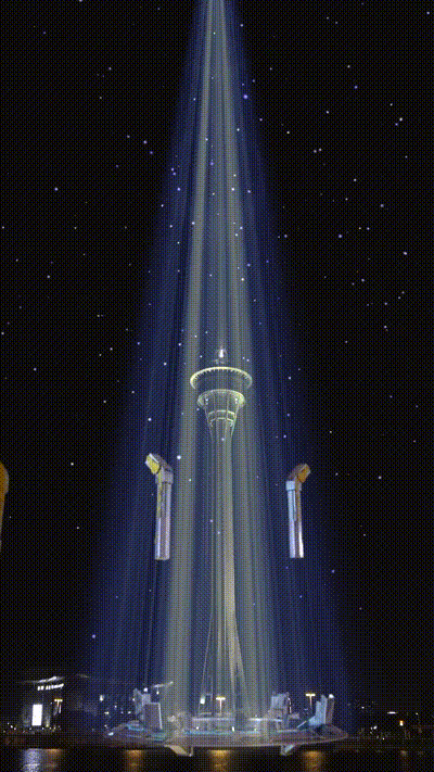 一束耀眼的红光从天空落下,点燃澳门塔之巅。