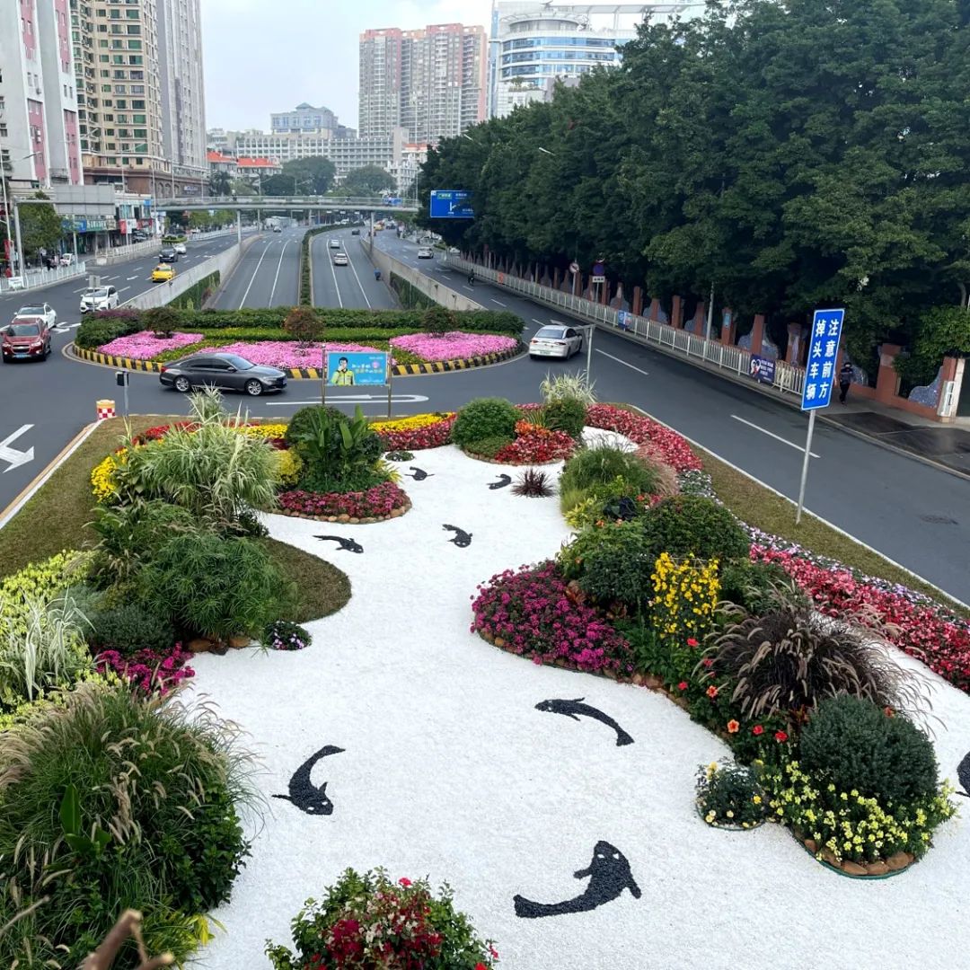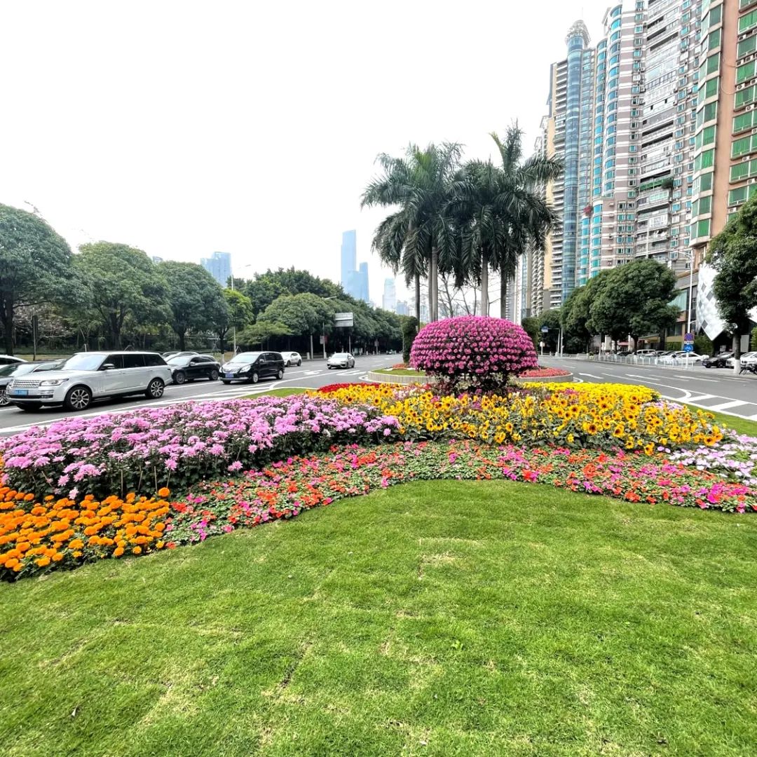 猎德四方岛位于猎德大道与花城大道交汇处,东南西北四方花境通过园艺师精心布置,方寸之间尽显特色。菊花、茶花以及各式新优时花互相呼应。整体造型高低错落,层次丰富,线条流畅,让路过市民,视线所致,皆是美景。