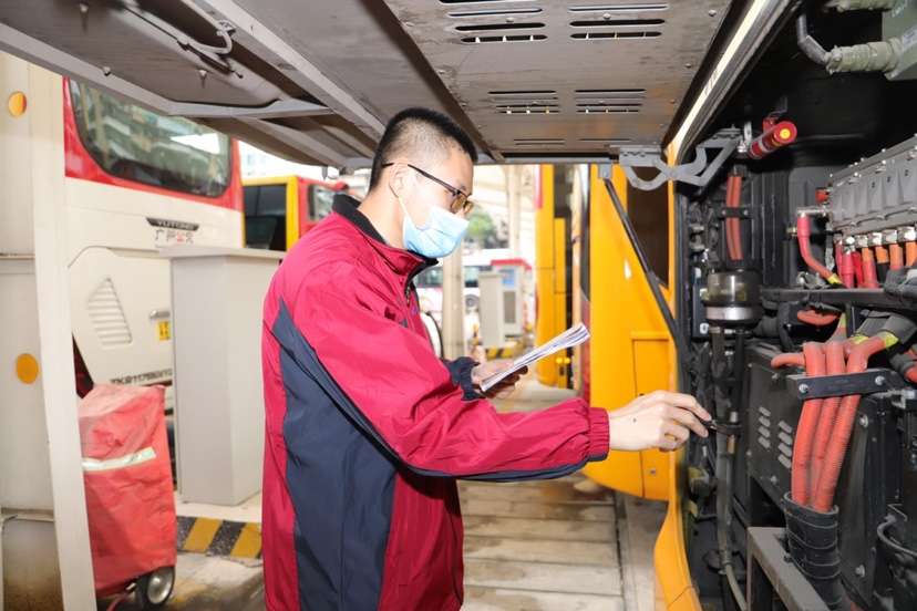 春节假期,路上的车辆和行人都少了很多。记者来到罗冲围总站时,遇到广州巴士集团二分公司789线的陈家浩车长前来取车。只见他先绕车一周,观察车辆外观,再打开发动机舱,检查有没有漏油漏水的情况,“发现问题就要及时解决,保障行车安全。”陈车长说。随后,是对车内的检查,座椅扶手、安全锤、驾驶位里的仪表……今年24岁的陈家浩脸庞稍显稚嫩,但工作起来马上进入状态,一丝不苟地检查每一个角落,并打开车窗进行通风。之后他便开向地铁沙贝站总站,开始接下来的营运。