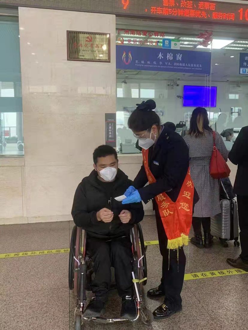10时20分,郭馨阳注意到一名坐轮椅的旅客,这名旅客在票厅内独自徘徊,不知该去哪个窗口办理业务。“您好,请问有什么可以帮您的吗?”郭馨阳立马走到旅客面前。原来,这名旅客想要退票,但是取了报销凭证,只能来窗口办理。了解情况后,郭馨阳带旅客来到9号红木棉售票窗口,为其优先办理业务。由于旅客坐在轮椅上,无法直接与窗口售票员进行沟通,郭馨阳就站在窗口旁帮旅客递话,与旅客仔细核对后帮其退票。离开时,郭馨阳还询问旅客是否有其他需要帮助的地方。旅客十分感动,为郭馨阳手写了一封感谢信才离开。