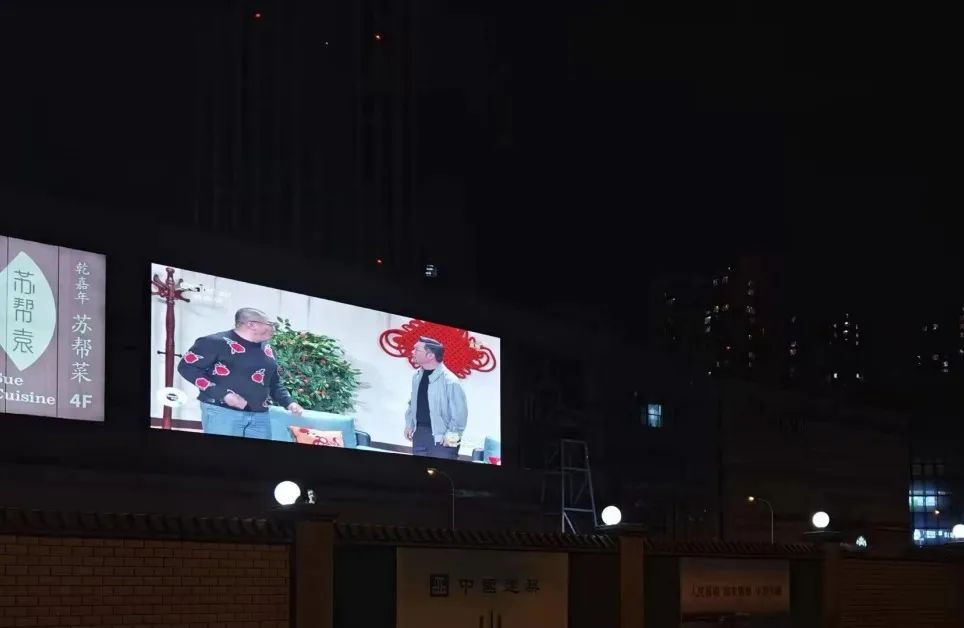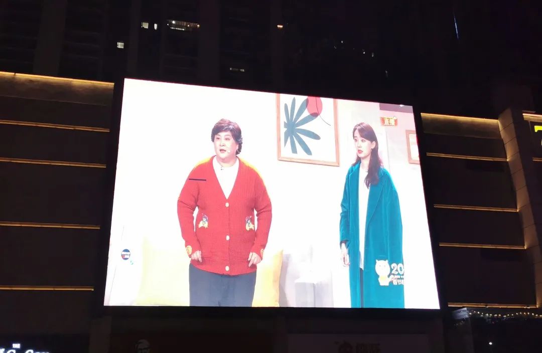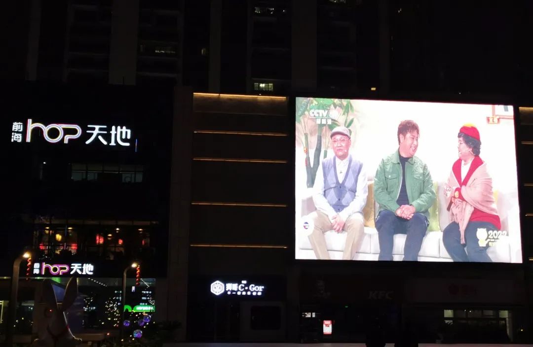 架设于深圳前海HOP天地的大屏上,正在上演由贾玲、张小斐主演的小品《喜上加喜》;