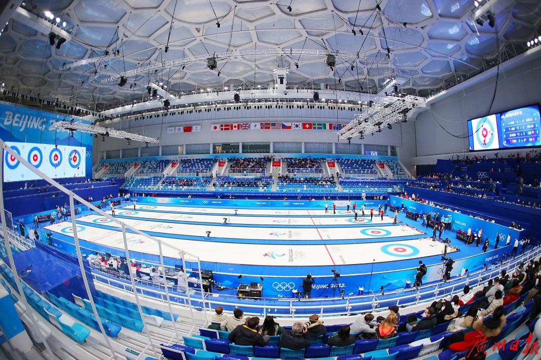 这场比赛所在的“冰立方”是冬奥会历史上体量最大的冰壶场馆,是世界唯一水上项目和冰上项目均可运行的双奥场馆,也是世界上首个在泳池上架设冰壶赛道的奥运场馆,这背后依靠的是可转换结构体系以及可拆装制冰系统等技术的创新应用,可谓是满满的高科技。