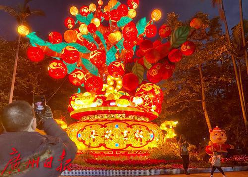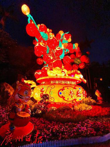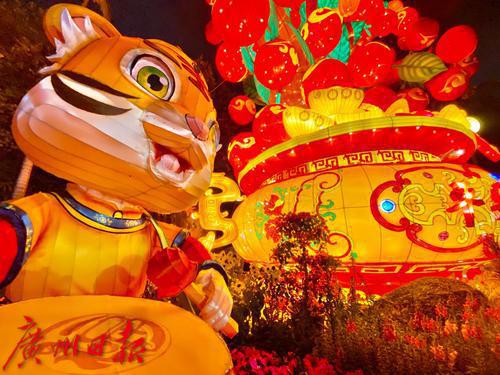 2022年春节期间,越秀公园夜晚灯饰“平安吉祥”吸引了许多晚饭后的游客前往。吉祥大灯两侧有两只小老虎,一只红灯送福,一只击鼓迎春,许多人拍照留影。文/广州日报·新花城记者 高鹤涛图/广州日报·新花城记者 高鹤涛