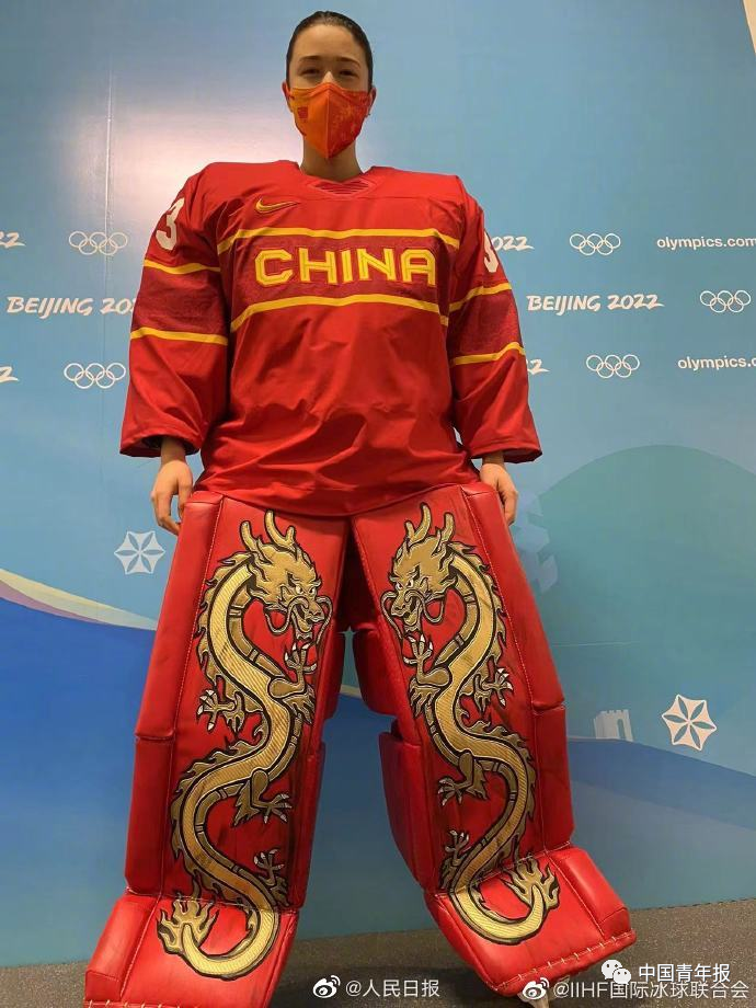 场上,中国女子冰球队门将的护膝上绣有双龙,头盔上也印有长城,不少网友把她的护腿称为“龙腾虎跃明墙盾”!