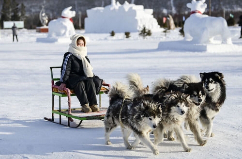 1月17日,一名游客在“冷极村”乘坐狗拉雪橇。新华社发(王正 摄)