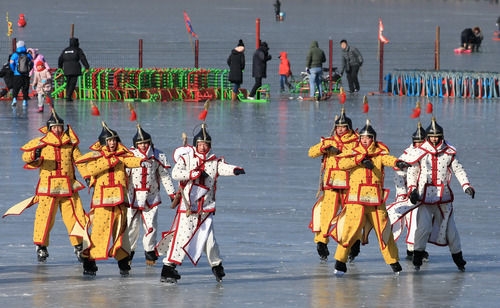 2017年1月21日,八旗兵装扮的演员在颐和园昆明湖冰场表演传统“冰嬉”。新华社发(刘宪国 摄)