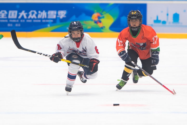2021年12月19日,在湖北武汉,小球员在“滑向2022”全国青少年冰球系列赛(武汉站)的比赛中。新华社记者 肖艺九 摄