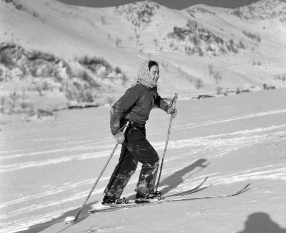 图为1956年2月,一名女青年在黑龙江省阿城县玉泉镇的滑雪场上滑雪。 新华社发(谭志强摄)
