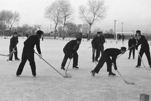 1954年12月15日发,东北农学院、东北林学院的学生在课外活动时打冰球。新华社记者胡伟摄