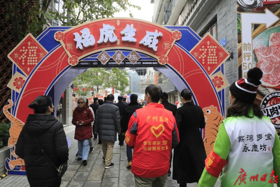 2月4日,正月初四,上午10时30分,一支由多宝派出所、多宝街城管办、市场监管、永庆坊物业、红棉老兵志愿服务队等多方力量组成的队伍,深入永庆坊片区开展联合巡查。
