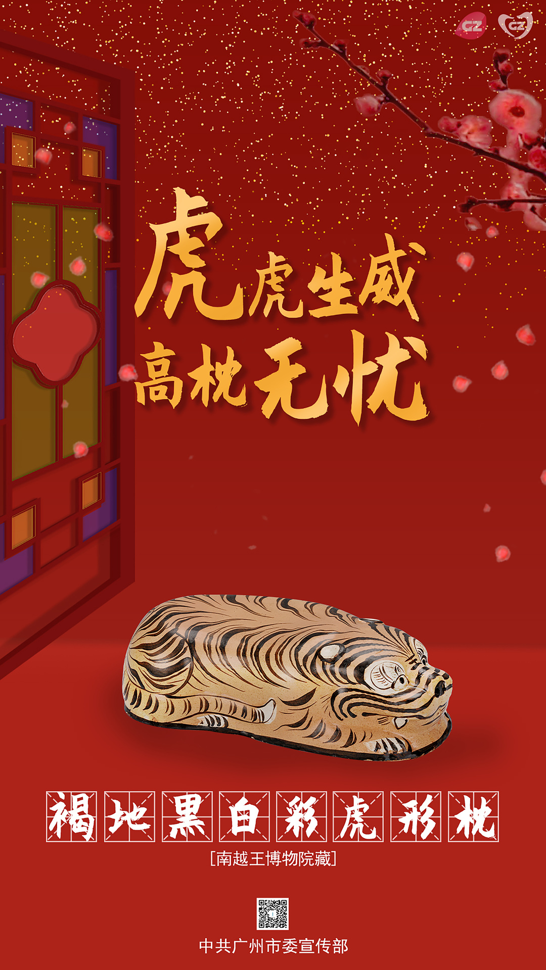 虎形枕是模仿老虎形状制成的寝具,以卧虎背部作枕面,对虎的外形进行处理,着意刻画虎头。南越王博物院院藏瓷枕中的虎形枕也以金代长治窑产品最多,均呈卧虎状,虎背平整内凹作枕面,枕面装饰题材丰富,以白地彩绘花鸟纹居多,也有诗文等装饰。瓷上绘画虎纹饰开创于宋而盛行于金代。瓷枕上的虎纹,以单只虎较为常见,且多有草木、树石为衬。金代磁州窑绘画老虎多作趴伏状和行走状,其造型稚拙随意,画风粗犷质朴,整体给人以“粗放之气”的艺术风格和时代特点。