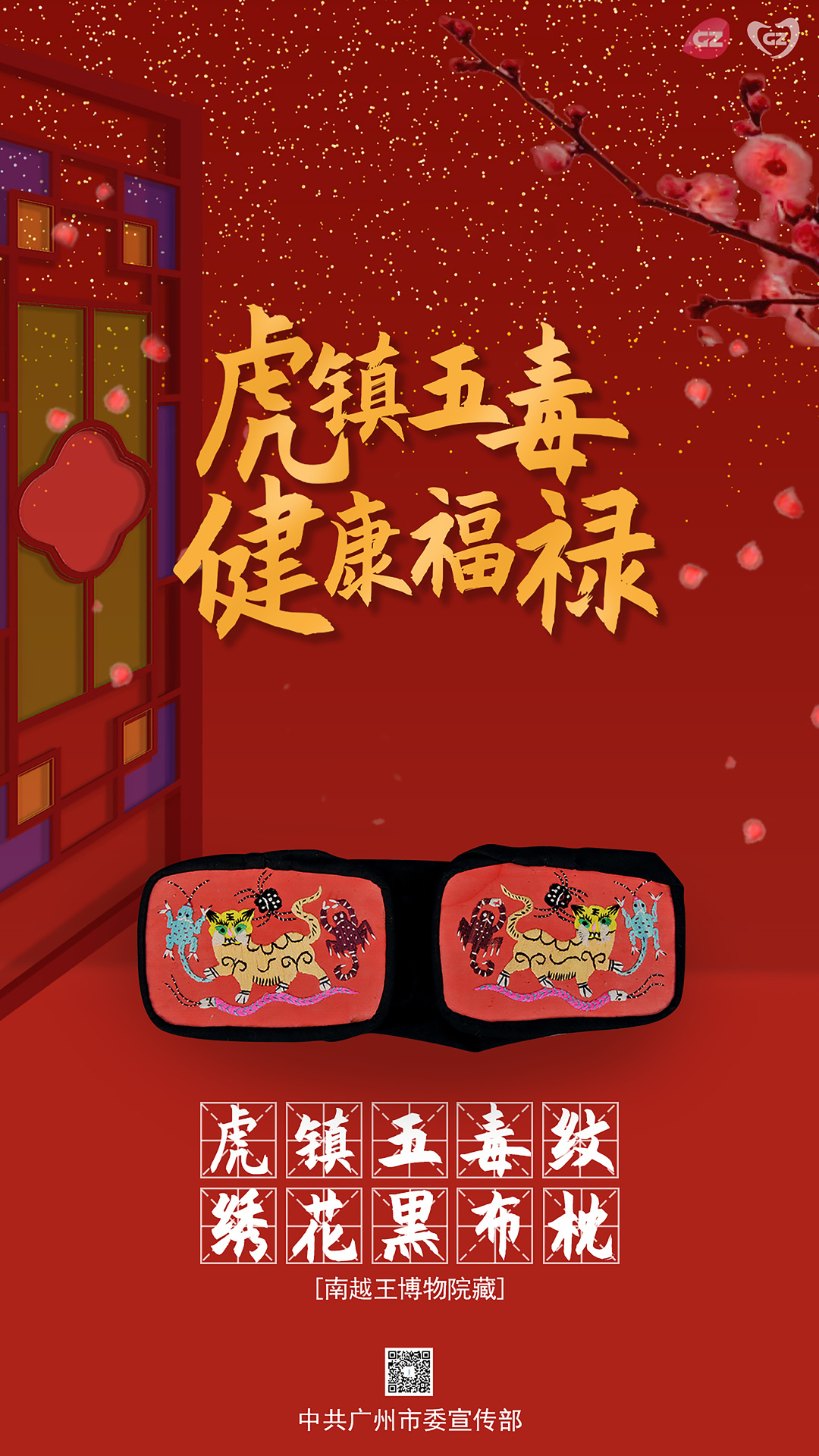 近代红缎地绣“虎镇五毒”图案黑布枕 (南越王博物院藏)在民间,虎的形象扮演着重要的角色。它以勇猛、强健的身姿,震慑、庇护的效力,深受人们的喜爱。在人们的心目中,猛兽成为了人们防御凶邪的“守护神”。虎镇五毒的意义在于,以老虎的正面力量,将各种妨害健康的祸疫予以歼灭。直到今天一些地区仍有向新生婴儿或婴儿过“百岁”赠送虎形枕头或耳枕的习俗。