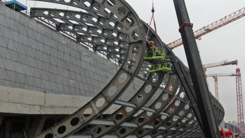 针对现场场地狭小及工序穿插问题,项目团队创新施工工艺,在38米的高空,设置大体积自稳定格构式拼装平台,为钢结构拼装“创造”高空作业面。还自主研发国内首例“滚针式滑靴”作为滑移轨道与桁架的连接构件,变传统的滑动摩擦为滚动摩擦,降低摩擦力,保障“钢铁巨无霸”的安全、平稳、高效滑移,创造国内异标高滚动滑移之最。每一个钢结构滑移单元跨度119.5米,最远需完成330.75米的“空中漫旅”。8个滑移单元要依次独立拼装,分批滑移。作业人员需要对过程中产生的应力、应变及挠度进行全时、全过程监测,以确保施工过程安全可靠。