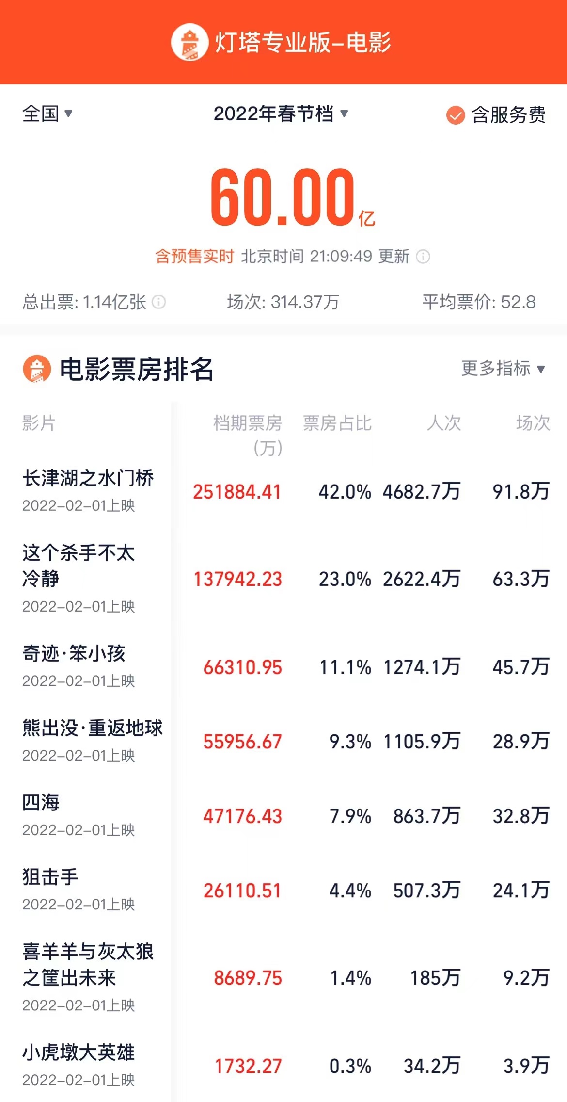 据灯塔专业版,截至2月6日21时9分,2022春节档(1.31-2.6)总票房正式突破60亿,超过2019春节档总票房59.05亿,目前位列中国影史春节档总票房第二。