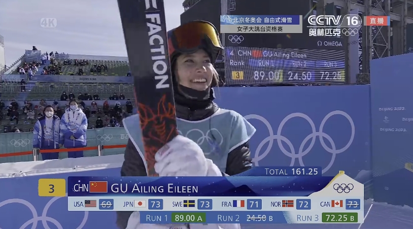△自由式滑雪女子大跳台资格赛第3轮,谷爱凌拿到72.25分