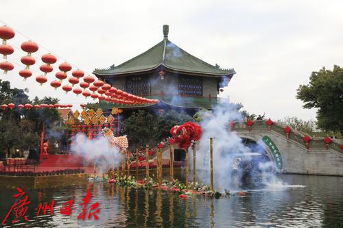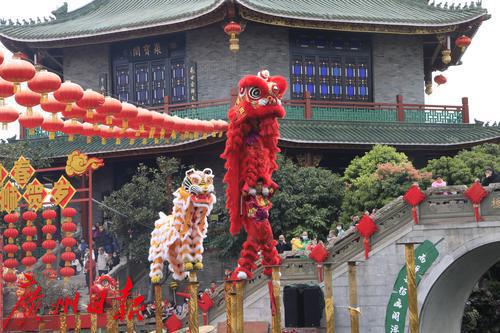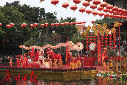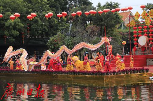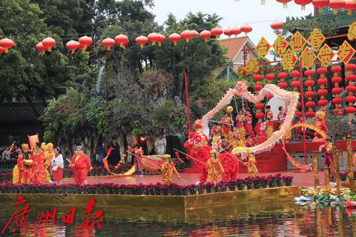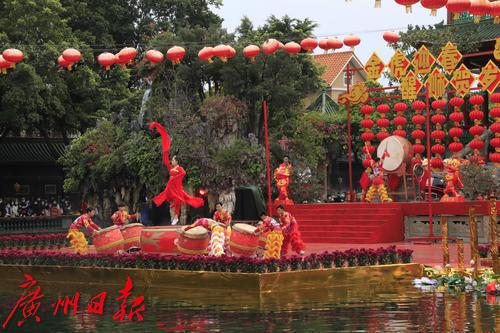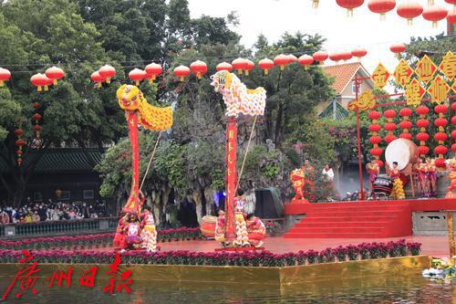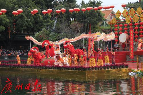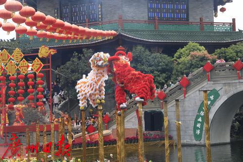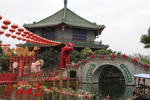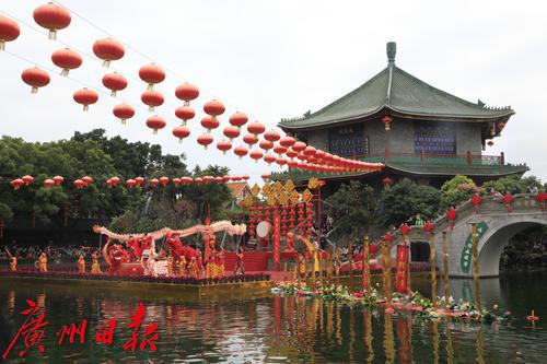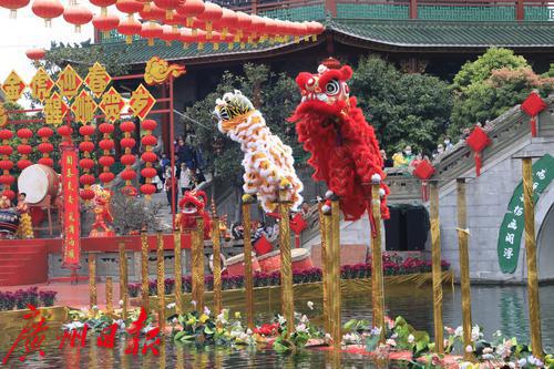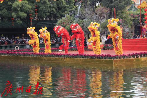 2022年春节期间,“金虎迎春,醒狮贺岁”——2022年宝墨园新春岭南醒狮民俗文化节启动,精彩的水上醒狮歌舞表演在宝墨园荔景湖水上舞台上演。