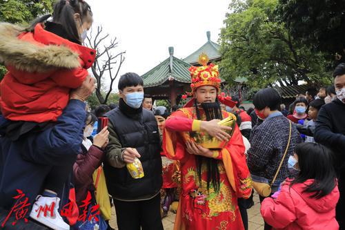 表演结束后,醒狮队伍还与财神组成巡游方阵与游客亲密互动,免费给游客大派利是分发财运。