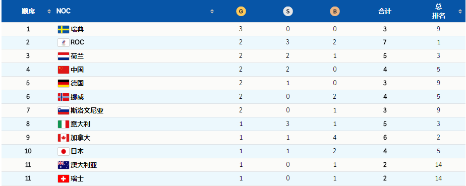 北京冬奥会2月7日产生了9面金牌,9个代表团各取其一。中国代表团共取1金2银,目前以2金2银排在奖牌榜第五位。瑞典队则以3面金牌继续领先金牌榜。