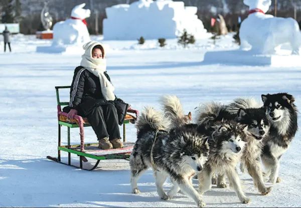 A visitor enjoys dog-sledding in Genhe, Inner Mongolia autonomous region. (Photo provided to China Daily)