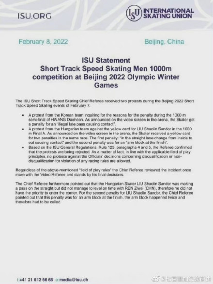 北京时间2月8日,国际滑联发声明,驳回韩国队和匈牙利队关于北京冬奥会短道速滑男子1000米的申诉。声明表示,主裁判已经与视频裁判共同对赛后视频进行审视判断,并维持既定判罚。
