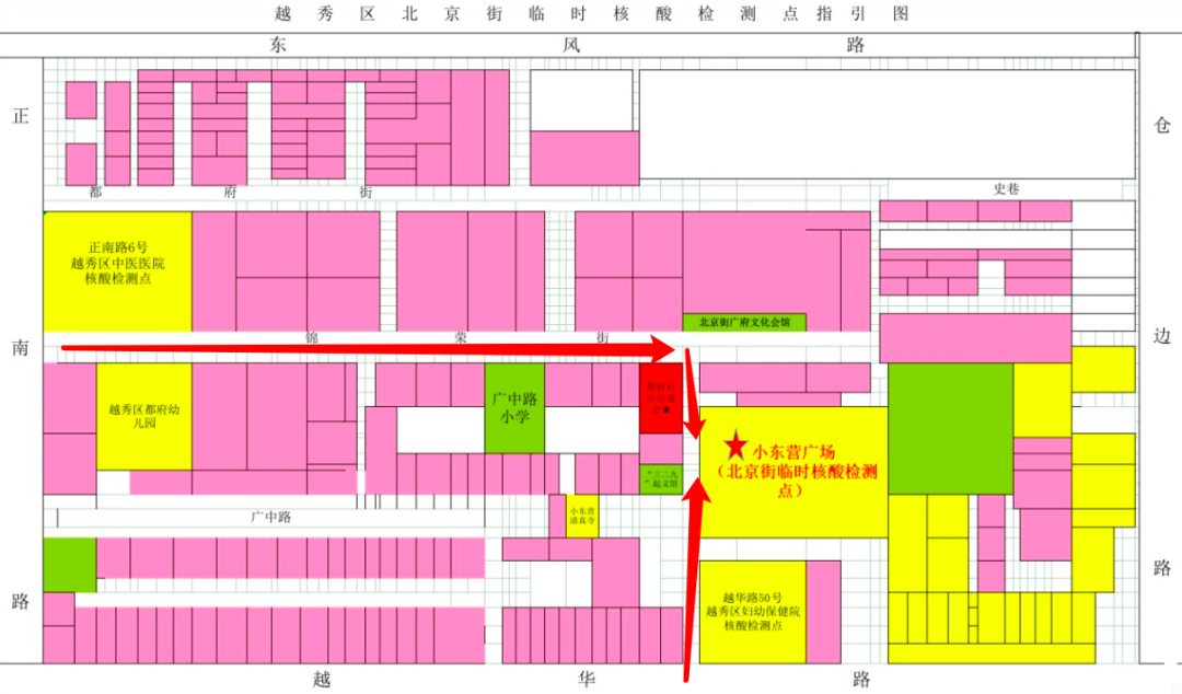 温馨提示:由于小东营广场附近的越秀区中医医院、越秀区妇幼保健院(越华院区)也设有核酸检测点,各位居民请认准北京街临时核酸检测点排队。(医院核酸检测为单人单管、32.5元/人,北京街临时核酸检测点为多人一管、8元/人,也可根据需要进行选择。)