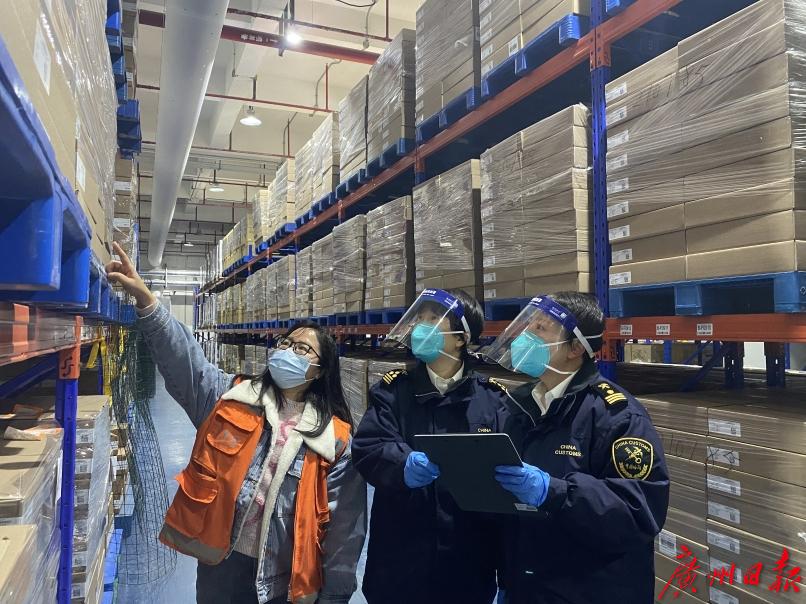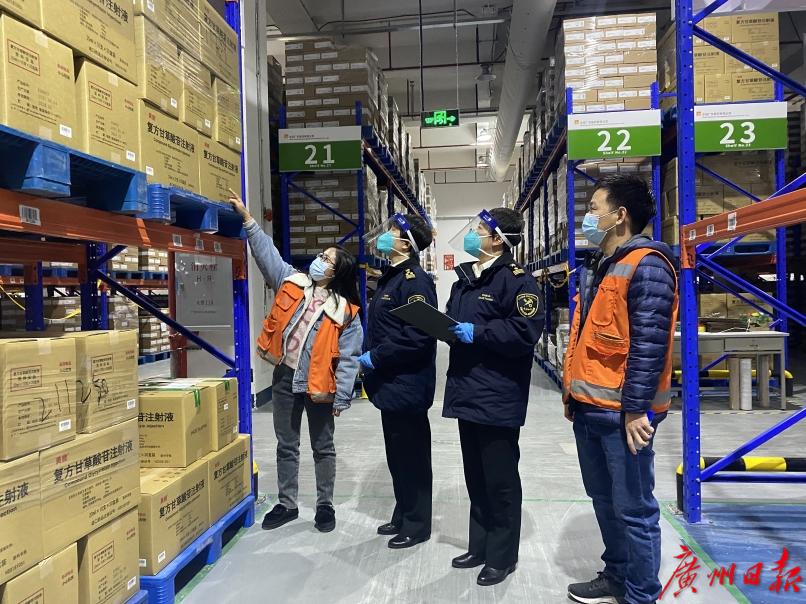 广州海关所属广州白云机场海关关员在口岸生物医药企业仓库调研。