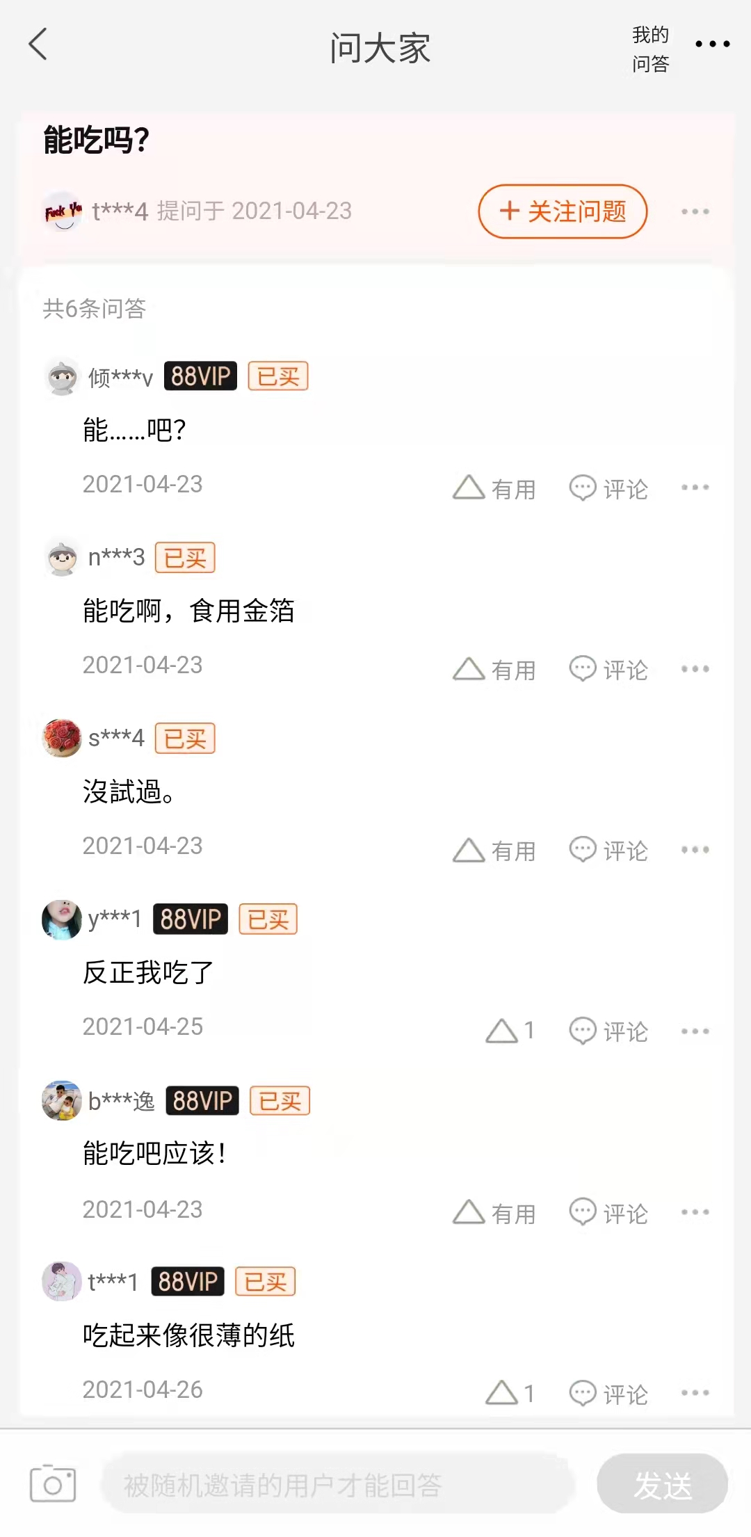 值得注意的,当前许多消费者并不清楚金箔银箔能否食用。在上述产品的下方,消费者在店铺询问“是否可以食用”,不少已经购买的消费者声称可以,并表示自己已经吃了。2月9日下午,记者再次登录该店铺,相关产品已经下架。