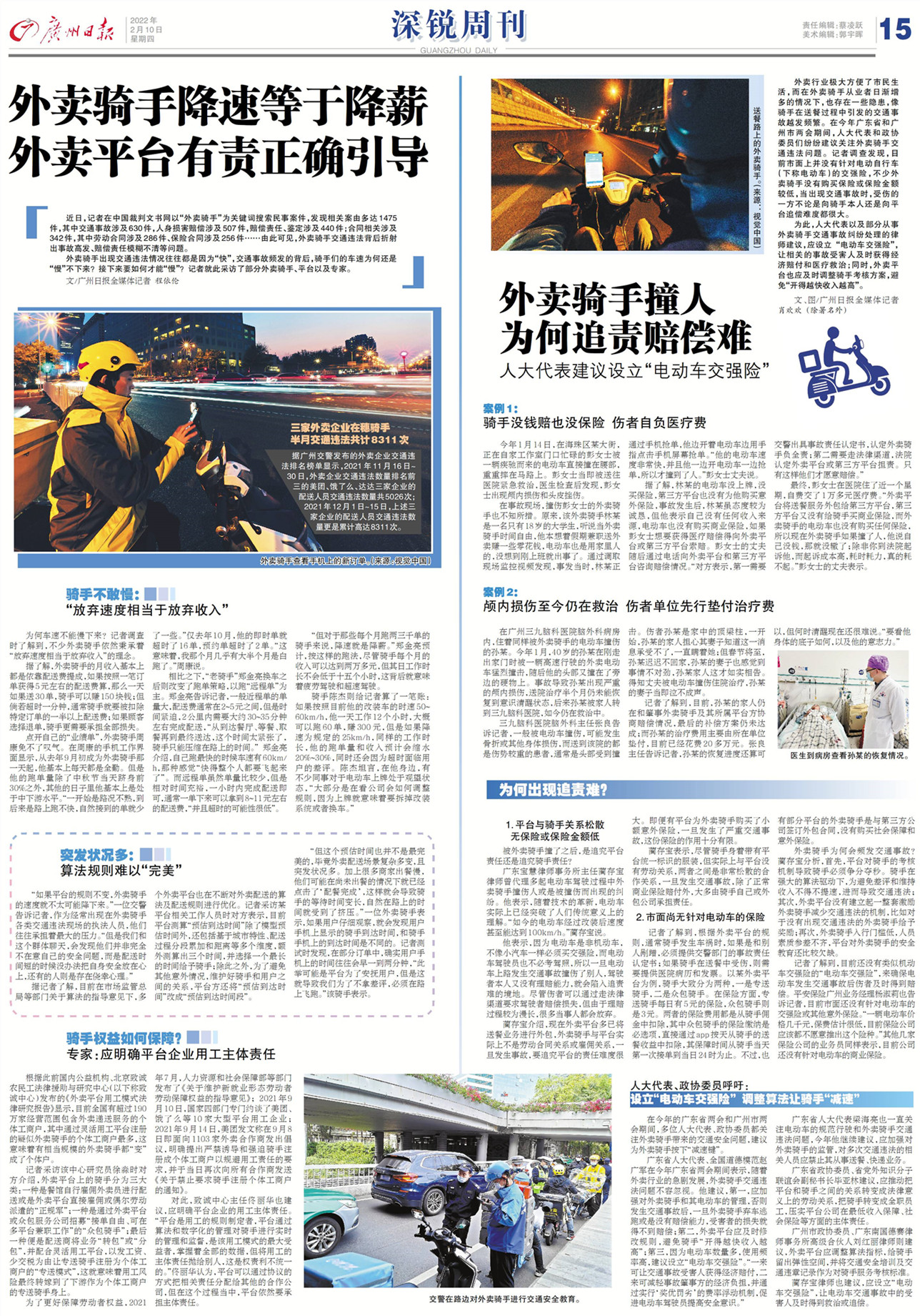外卖行业极大方便了市民生活,而在外卖骑手从业者日渐增多的情况下,也存在一些隐患,像骑手在送餐过程中引发的交通事故越发频繁。在今年广东省和广州市两会期间,人大代表和政协委员们纷纷建议关注外卖骑手交通违法问题。记者调查发现,目前市面上并没有针对电动自行车(下称电动车)的交强险,不少外卖骑手没有购买保险或保险金额较低,当出现交通事故时,受伤的一方不论是向骑手本人还是向平台追偿难度都很大。