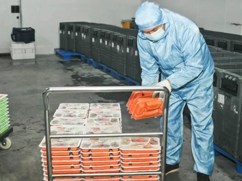 为了让旅客吃上放心餐,一份盒饭从采购、加工、制作、包装到冷却、运输、送上高铁,要经过十多道工序。