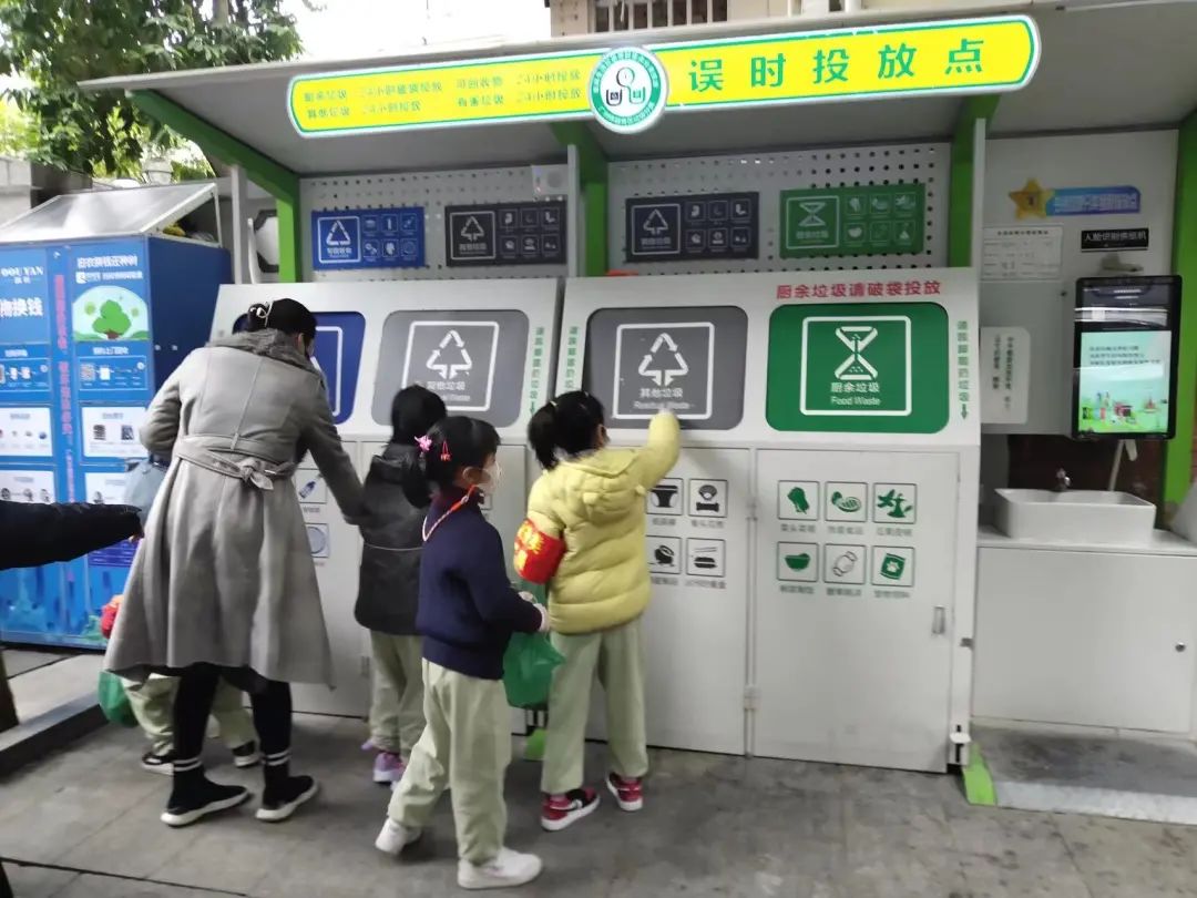 随后,学生们和家长志愿者一起来到社区开展环保志愿活动,社区工作人员将孩子们带回到垃圾投放点,观察小区居民们垃圾分类及投放的方法。孩子们认真地观察居民垃圾袋里的垃圾,按照类别判断应投放的垃圾桶,遇到自己不会判断的,就请教工作人员。