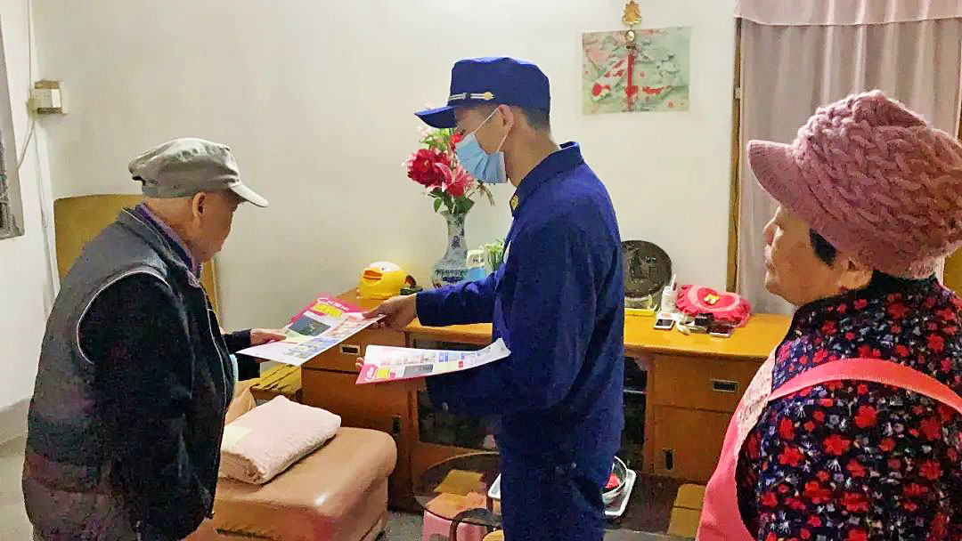 消防队员向老人发放消防安全知识宣传单张,普及不要私拉乱接电线、不能一插座多用、出门前必须关闭电器等知识,提醒老人临睡前一定要将天然气阀门关闭。
