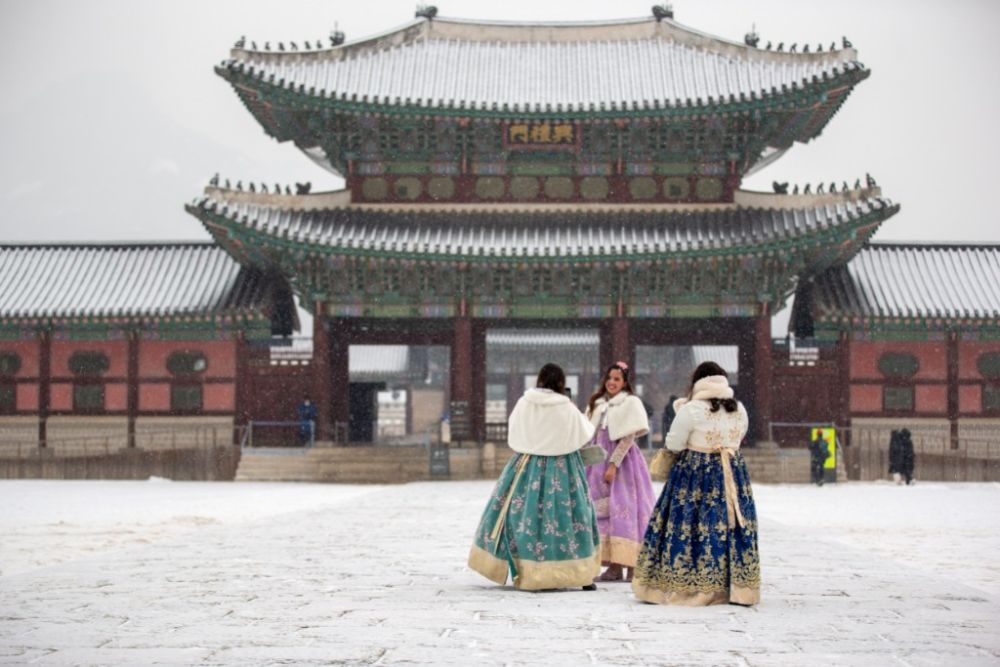 1月19日,在韩国首尔,游客在雪中游览景福宫。(新华社记者王益亮摄)