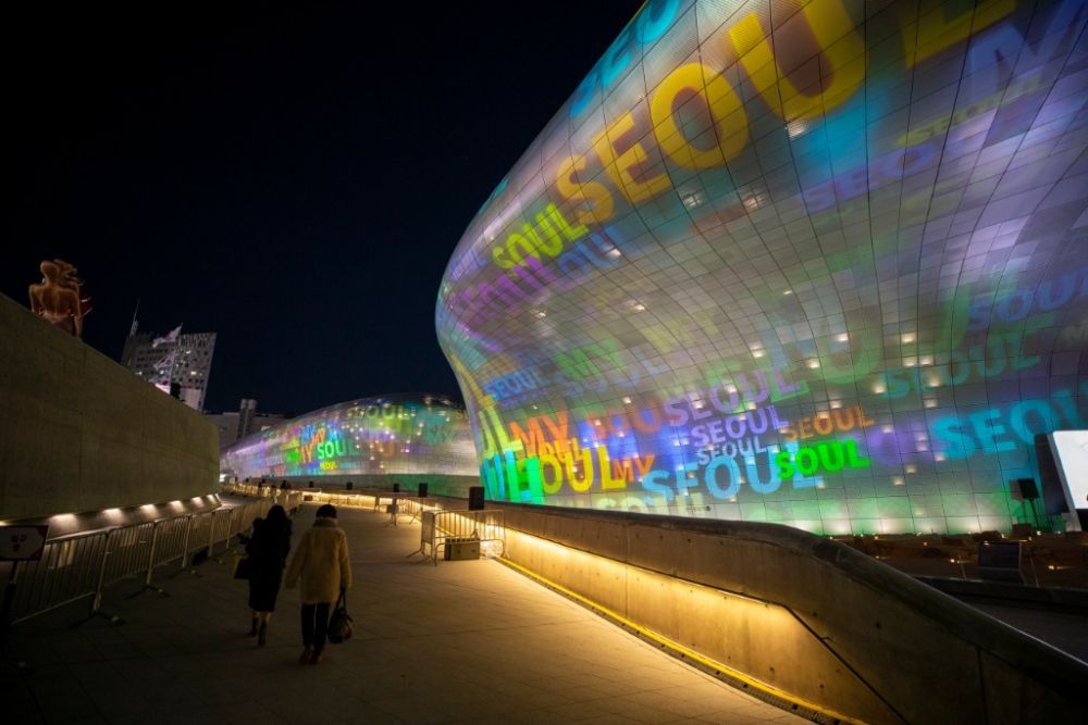 2021年12月17日在韩国首尔东大门设计广场拍摄的“首尔之光”灯光秀。(新华社记者王益亮摄)