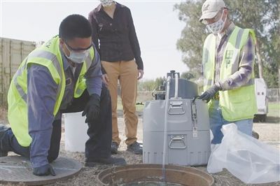 加州大学伯克利分校研究人员开发了一种从下水道系统中收集未经处理的污水并测试其是否存在新冠病毒的方法。图为该校员工从下水道中取出废水自动进样器。图片来源:艾琳易/加州大学伯克利分校