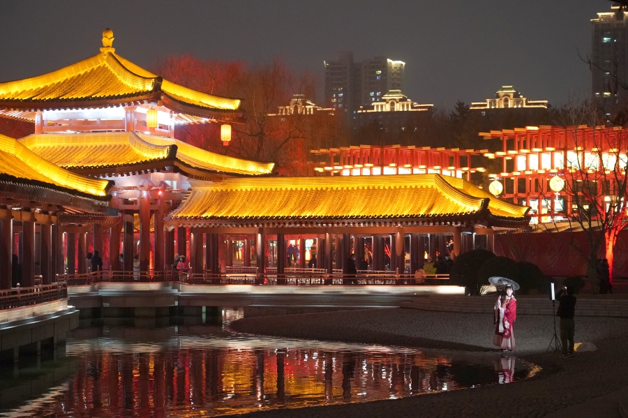 2月10日,游客在大唐芙蓉园内拍照游玩。元宵节即将到来,西安大唐芙蓉园内花灯璀璨、流光溢彩,吸引游客市民前来观赏。新华社发(熊世钰摄)