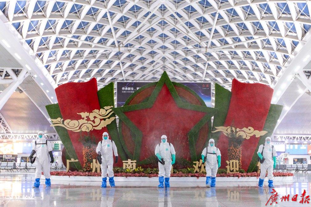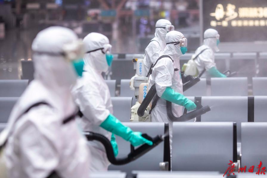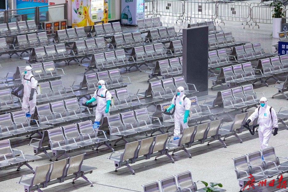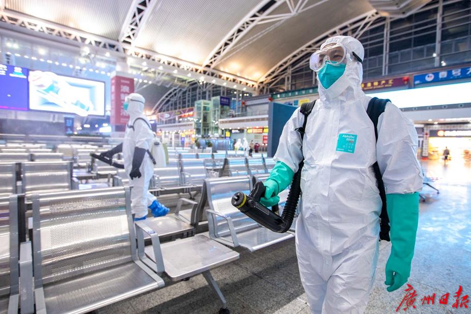 “随着返程高峰到来,这几天广州南站客流量激增,加上广东又有零星病例出现,我们更需要严阵以待。为了进一步提高广州南站的安全系数,保障旅客安全,我们决定今晚做一次车站大厅的全面预防性消毒。”广州铁路疾病预防控制中心病媒生物防制部部长戚剑雄向记者介绍,“春运期间,广州南站每天都会开行多趟夜间高铁,就是人们常说的红眼高铁。正好今晚车次不多,23点多今天最后一趟高铁开走后,要到第二天清早5点多才有高铁发出,这就给了我们干活的好时机。”