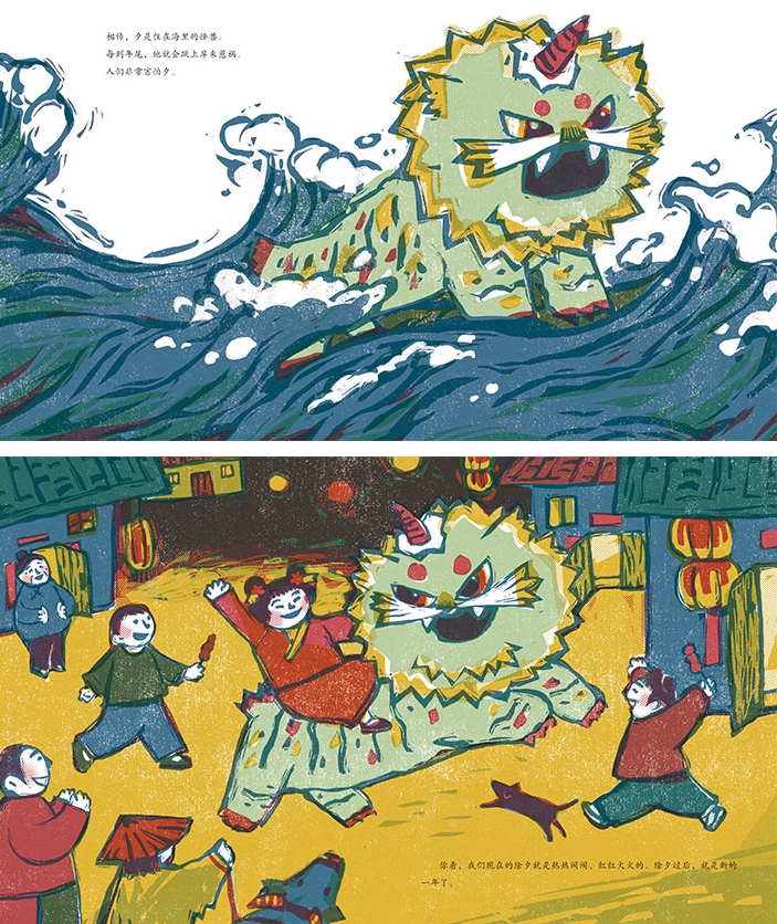 以除夕为例,在传统的故事中,夕是一个恐怖的兽,人们在年终岁尾,会通过放鞭炮、贴对联、挂红灯笼来驱赶它,以免其祸害人间,体现的是一种不友好的对立关系。而在《中国节》这套绘本故事中,作者将除夕故事中的夕设计成外形高大、可怕,但内心却住着一个孤独胆小、渴望伙伴的小孩“海兽”。